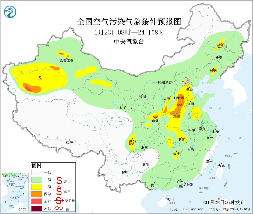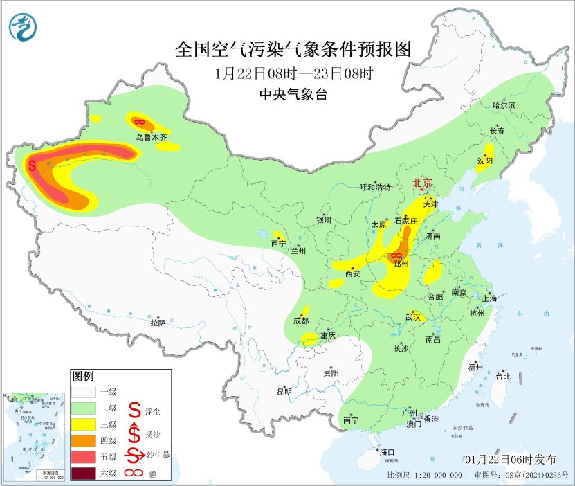22日,区域大部大气扩散条件逐步转差,山西中南部、陕西关中等地的部分地区有将有轻至中度霾。