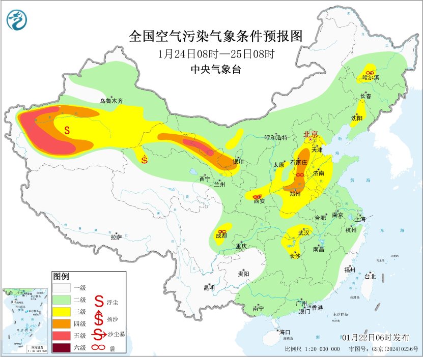 22日至24日,区域北部部分地区有间歇性轻度霾天气。
