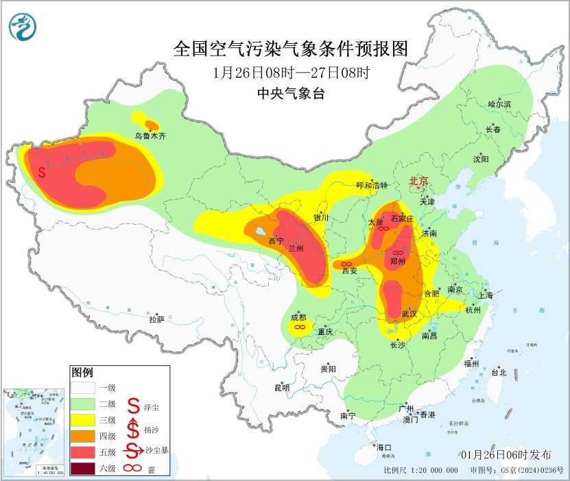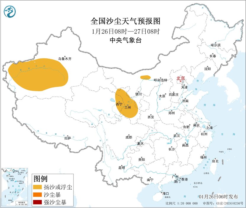 此外,26日,新疆南部、青海东北部、甘肃中东部等地的部分地区仍有扬沙或浮尘天气。
