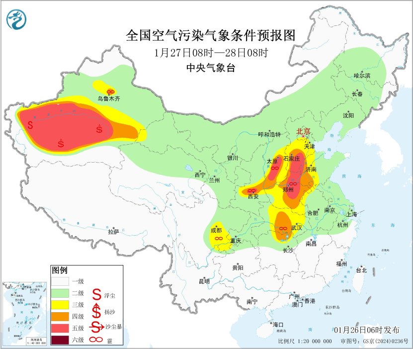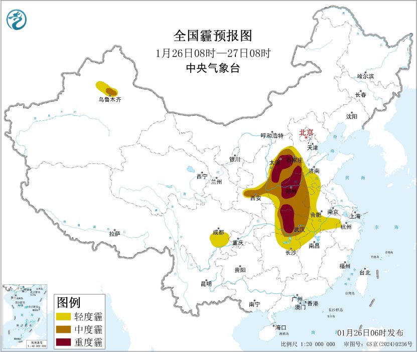 26日早晨至28日,华北中南部、黄淮中西部、汾渭平原等地大气扩散条件较差,有轻至中度霾,部分地区有重度霾,夜间至早晨时段部分地区有大雾。29日起,受冷空气和降水共同影响,雾、霾天气逐渐减弱或消散。