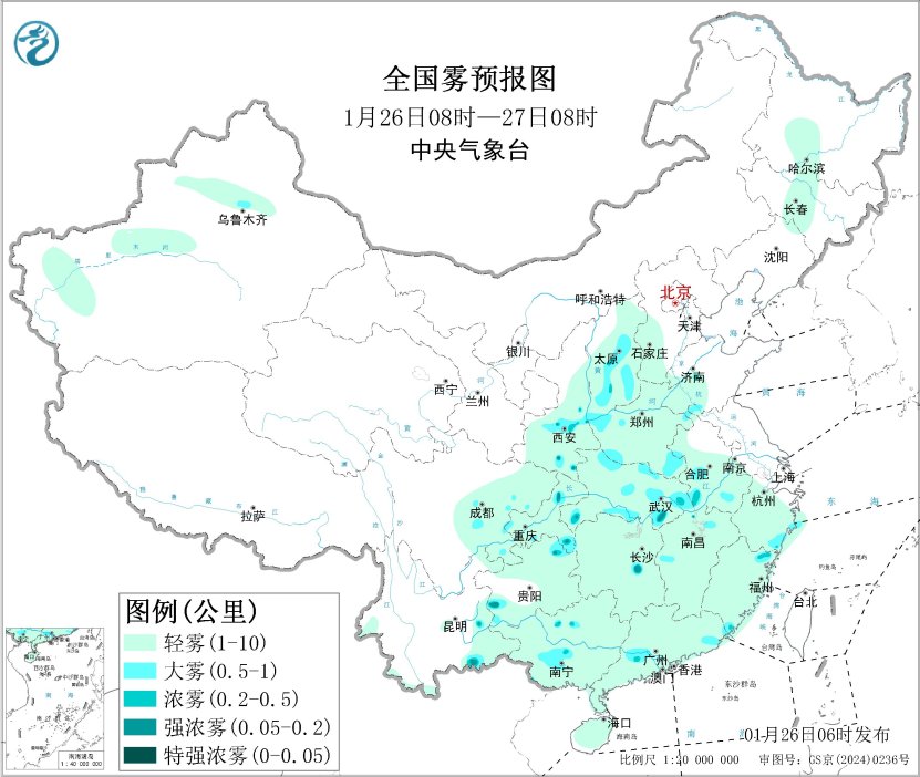 26日起,区域多降水,大气湿清除条件较好,但受传输影响,区域北部有间歇性轻度霾。26日早晨,湖北西北部和东南部等地的部分地区有大雾天气。