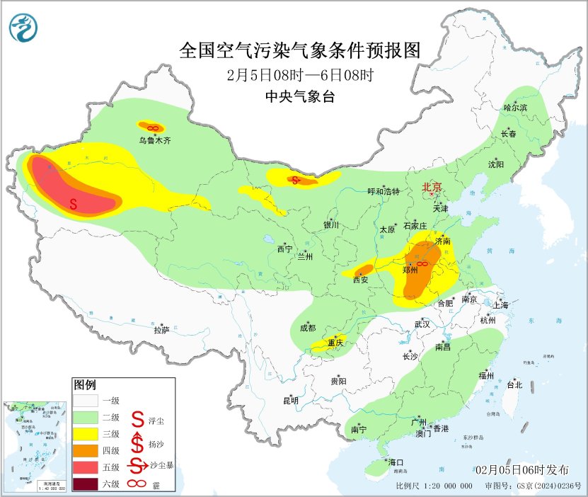 5日白天,区域中北部等地大气扩散条件一般,部分地区有轻度霾。5日夜间起,区域大部地区大气扩散条件转好。