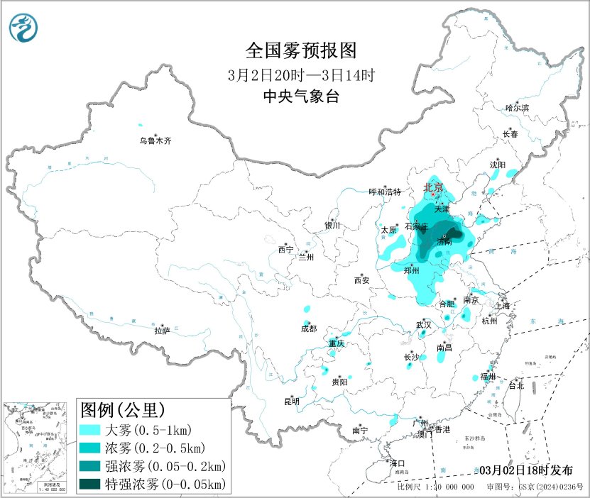 2日夜间至3日上午,北京、天津、河北中南部、河南中东部、山东中西部等地的部分地区有大雾天气,其中,河北南部、河南北部、山东西北部等地的部分地区有能见度不足200米的强浓雾,局地有能见度不足50米的特强浓雾,中央气象台3月2日18时发布大雾橙色预警。