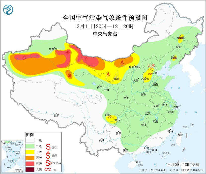 未来一周,全国大部地区大气扩散和湿清除条件较好,无持续性霾天气。11日至13日,受冷空气大风影响,新疆东部和南部、内蒙古西部、青海北部、甘肃西部、宁夏等地的部分地区有扬沙或浮尘天气,局地有沙尘暴。