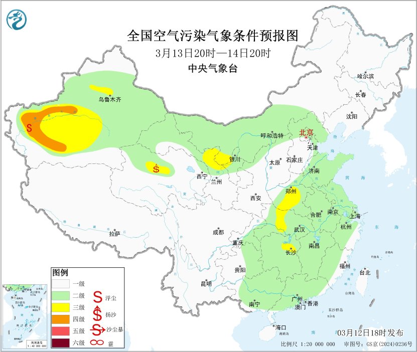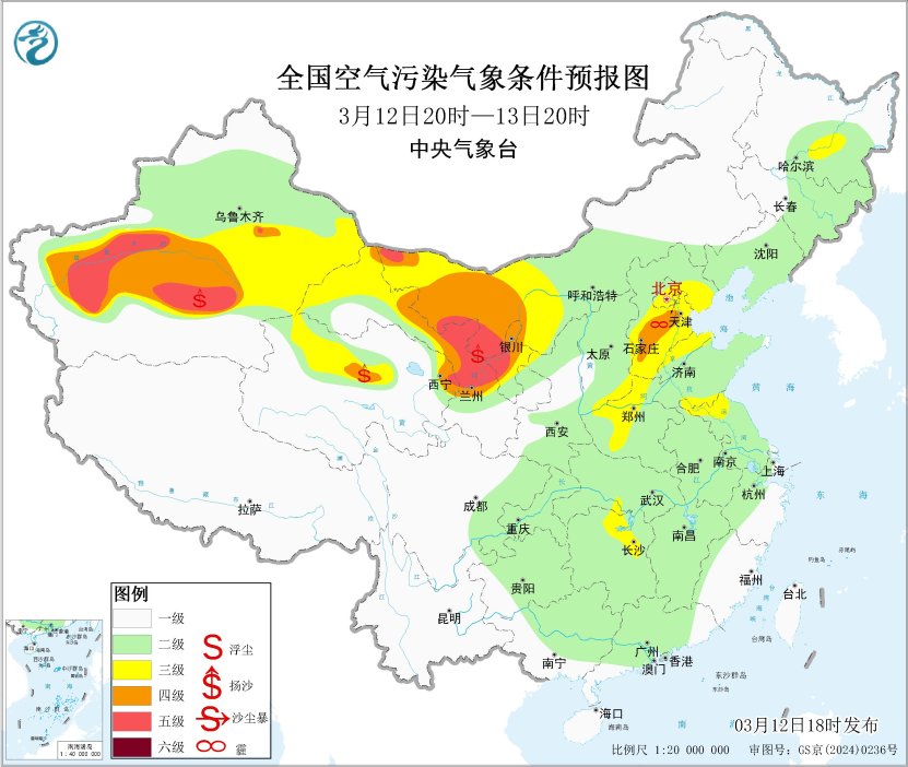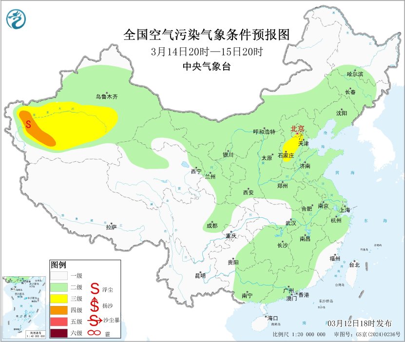 未来一周,全国大部地区大气扩散和湿清除条件较好,无持续性霾天气。受大风天气影响,预计3月12日20时至13日20时,新疆南部、内蒙古西部、甘肃西部、青海北部、宁夏中北部等地的部分地区有扬沙或浮尘天气,其中,新疆南部、内蒙古西部局地有沙尘暴,中央气象台于3月12日18时继续发布沙尘暴蓝色预警。