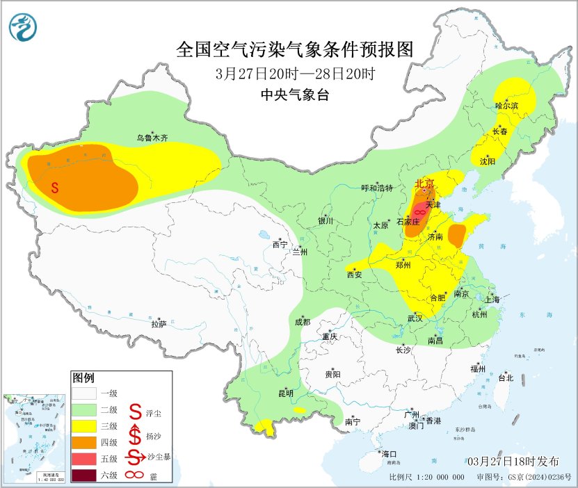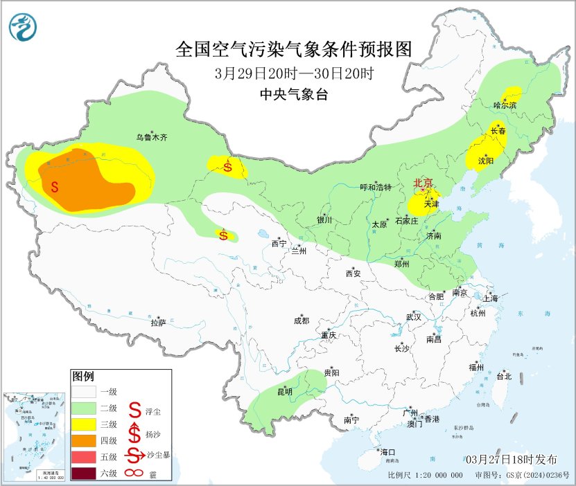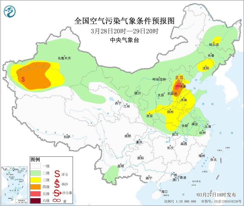 27日夜间至29日,华北、黄淮、江淮中东部、东北等地大气扩散条件较差,有轻至中度霾,局地重度霾。29日夜间起,受冷空气影响,霾天气逐渐减弱或消散。