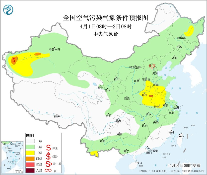 未来一周,全国大部大气扩散和湿清除条件总体较好,无大范围霾天气。4月2日至4日,西北、华北、黄淮西部等地的部分地区自西向东有扬沙或浮尘天气,其中内蒙古西部、甘肃西部等地的局部地区有沙尘暴。