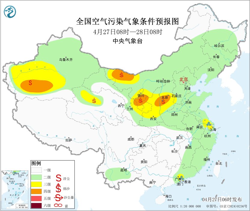 27日至28日,受冷空气影响,内蒙古西部、山西中南部、陕西中部、宁夏、甘肃中西部、青海柴达木盆地、新疆南部等地的部分地区有扬沙或浮尘天气。29日夜间至5月1日,受新一股冷空气影响,内蒙古西部、宁夏、甘肃中西部、青海柴达木盆地、新疆南部有扬沙或浮尘天气。