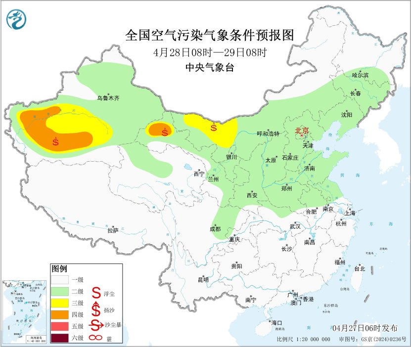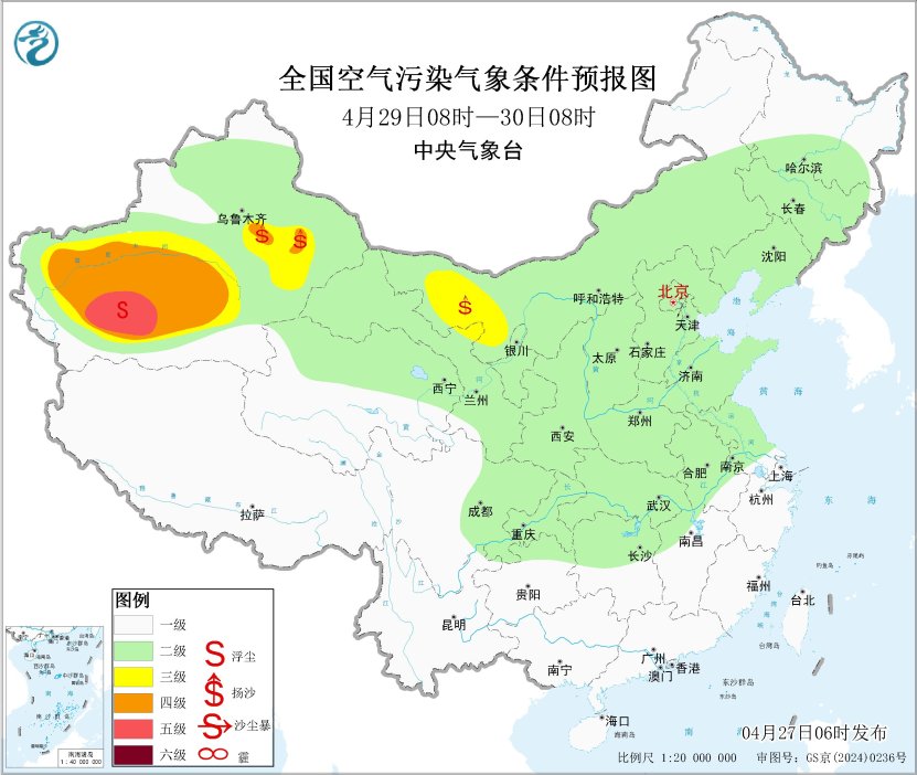 27日至28日,内蒙古西部、山西中南部、陕西中部、宁夏、甘肃中西部、青海柴达木盆地、新疆南部等地的部分地区有扬沙或浮尘天气。29日夜间至5月1日,受新一股冷空气影响,内蒙古西部、宁夏、甘肃中西部、青海柴达木盆地、新疆南部有扬沙或浮尘天气。