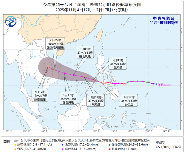 预警 2025-11-04 18:00中央气象台11月4日18时继续发布台风蓝色预警