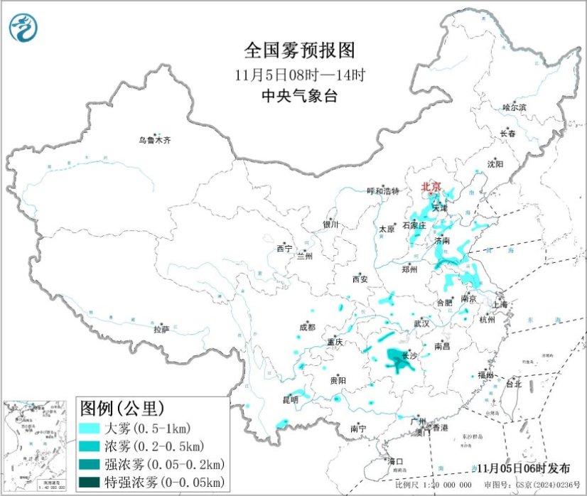 预警 2025-11-05 10:01中央气象台11月5日06时继续发布大雾黄色预警