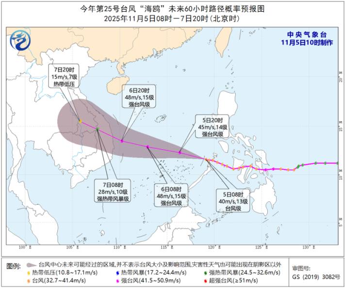 预警 2025-11-05 06:00台风“海鸥”最新位置:北纬12.0度, 东经117.1度,中心附近最大风力14级