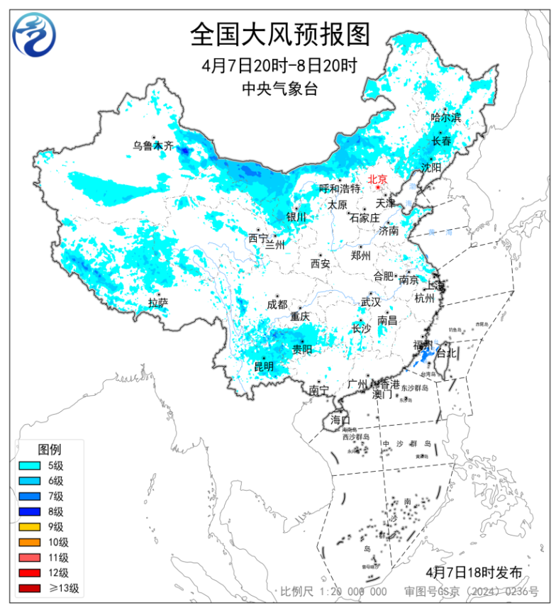 中央气象台4月7日18时继续发布大风蓝色预警
