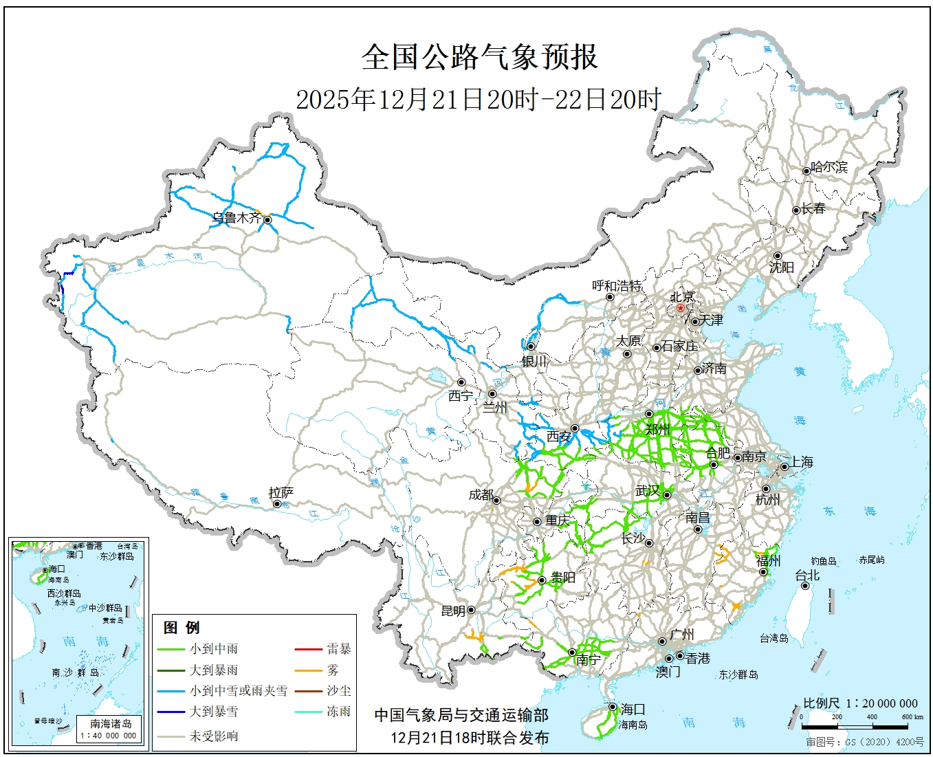 中国气象局与交通运输部2025年12月21日联合发布全国主要公路气象预报