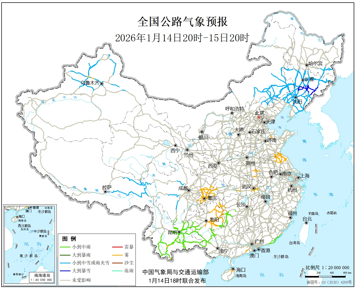 中国气象局与交通运输部2026年01月14日联合发布全国主要公路气象预报