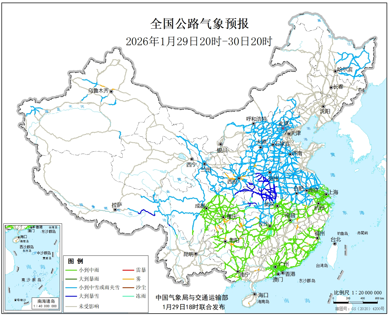 中国气象局与交通运输部2026年01月29日联合发布全国主要公路气象预报