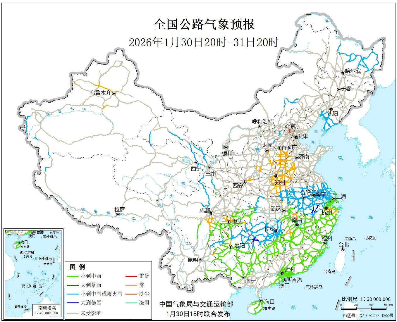 中国气象局与交通运输部2026年01月30日联合发布全国主要公路气象预报