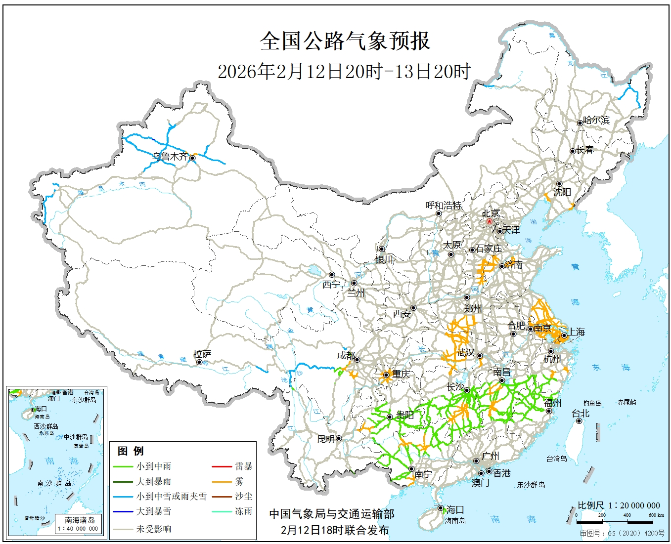 中国气象局与交通运输部2026年02月12日联合发布全国主要公路气象预报