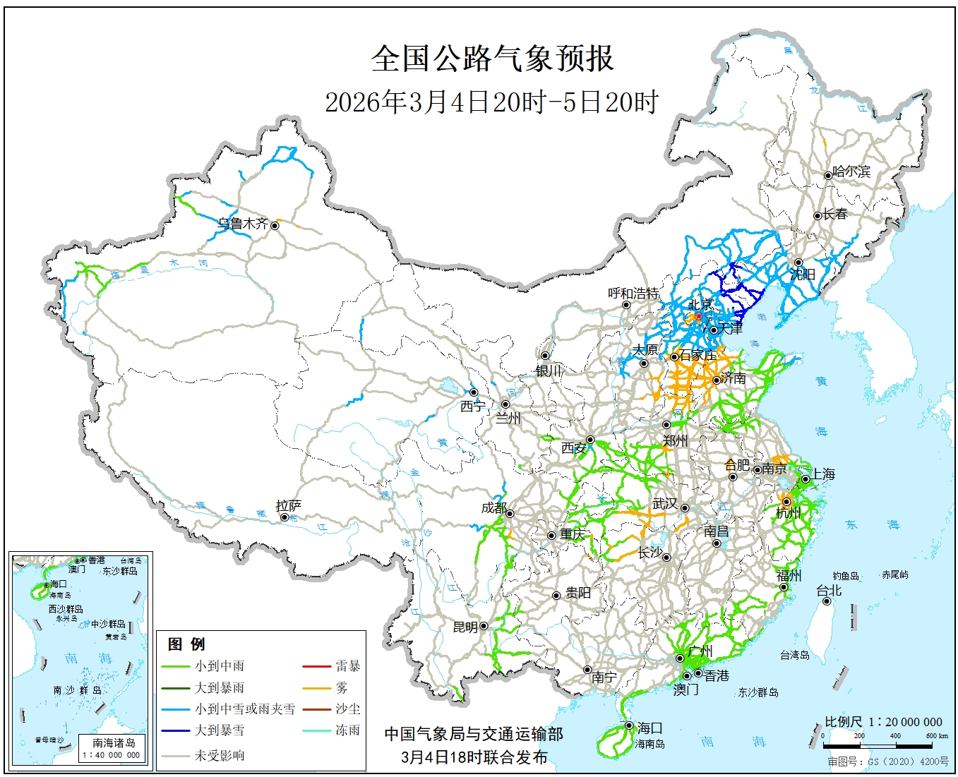 中国气象局与交通运输部2026年03月04日联合发布全国主要公路气象预报