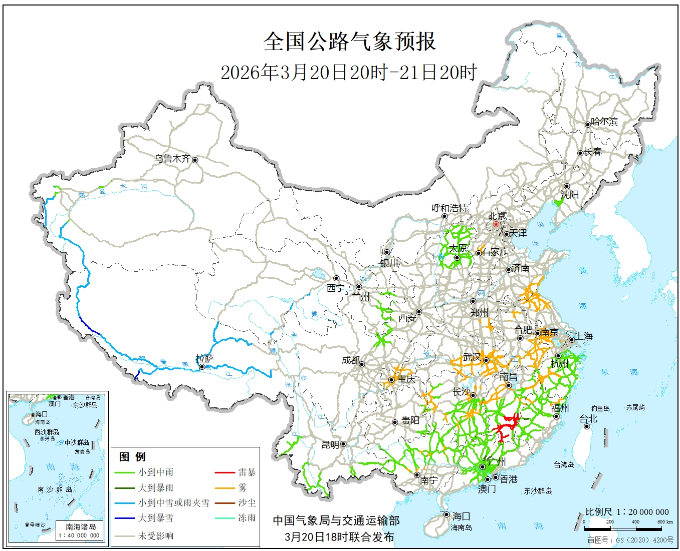 中国气象局与交通运输部2026年03月20日联合发布全国主要公路气象预报