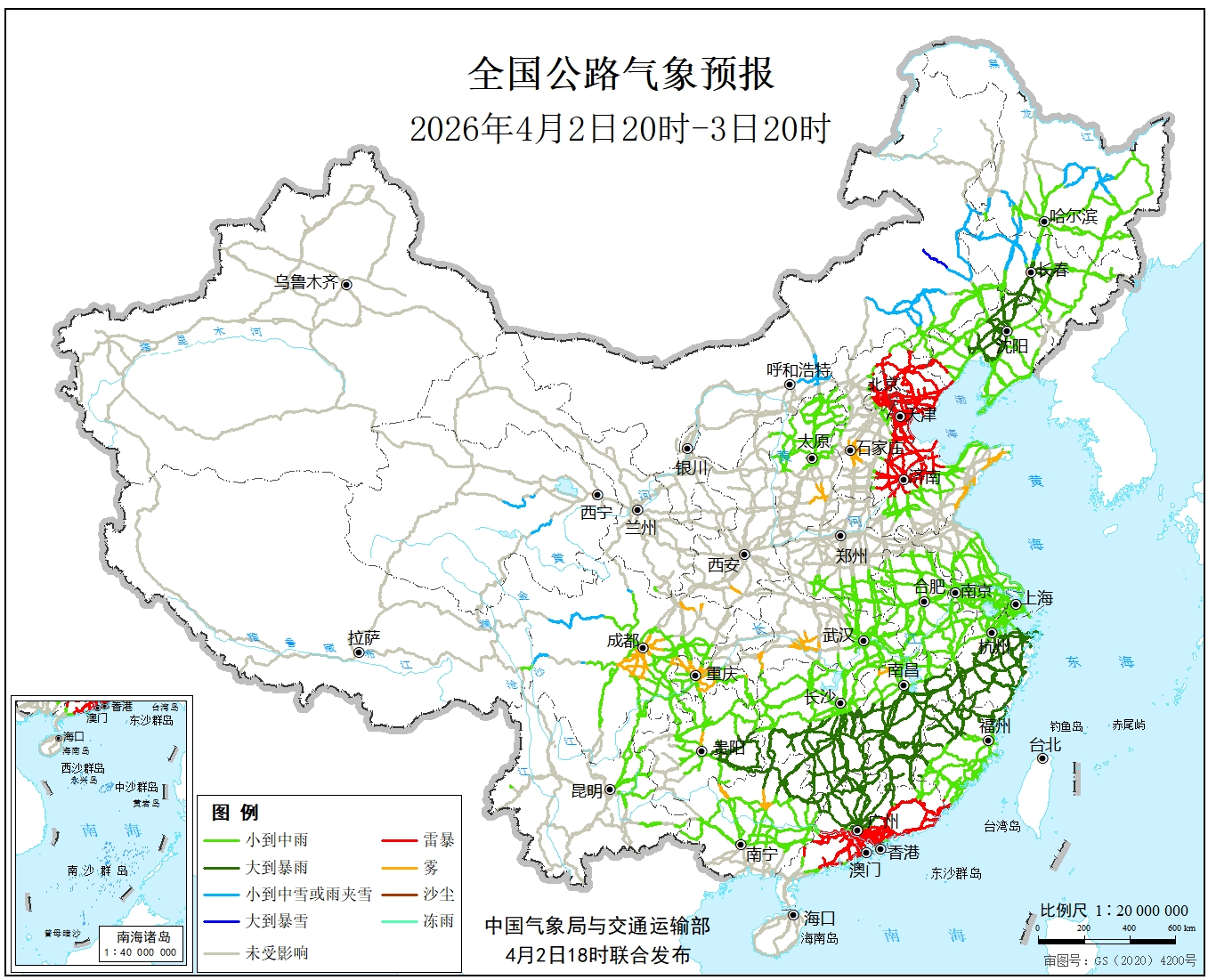 中国气象局与交通运输部2026年04月02日联合发布全国主要公路气象预报