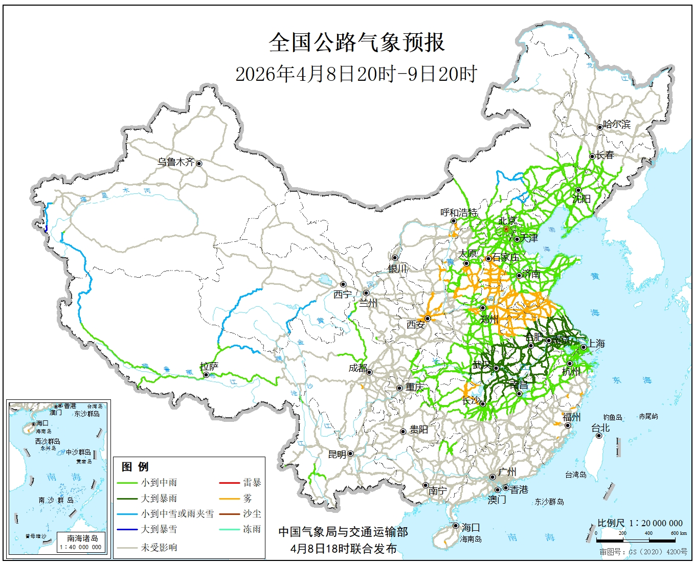 中国气象局与交通运输部2026年04月08日联合发布全国主要公路气象预报