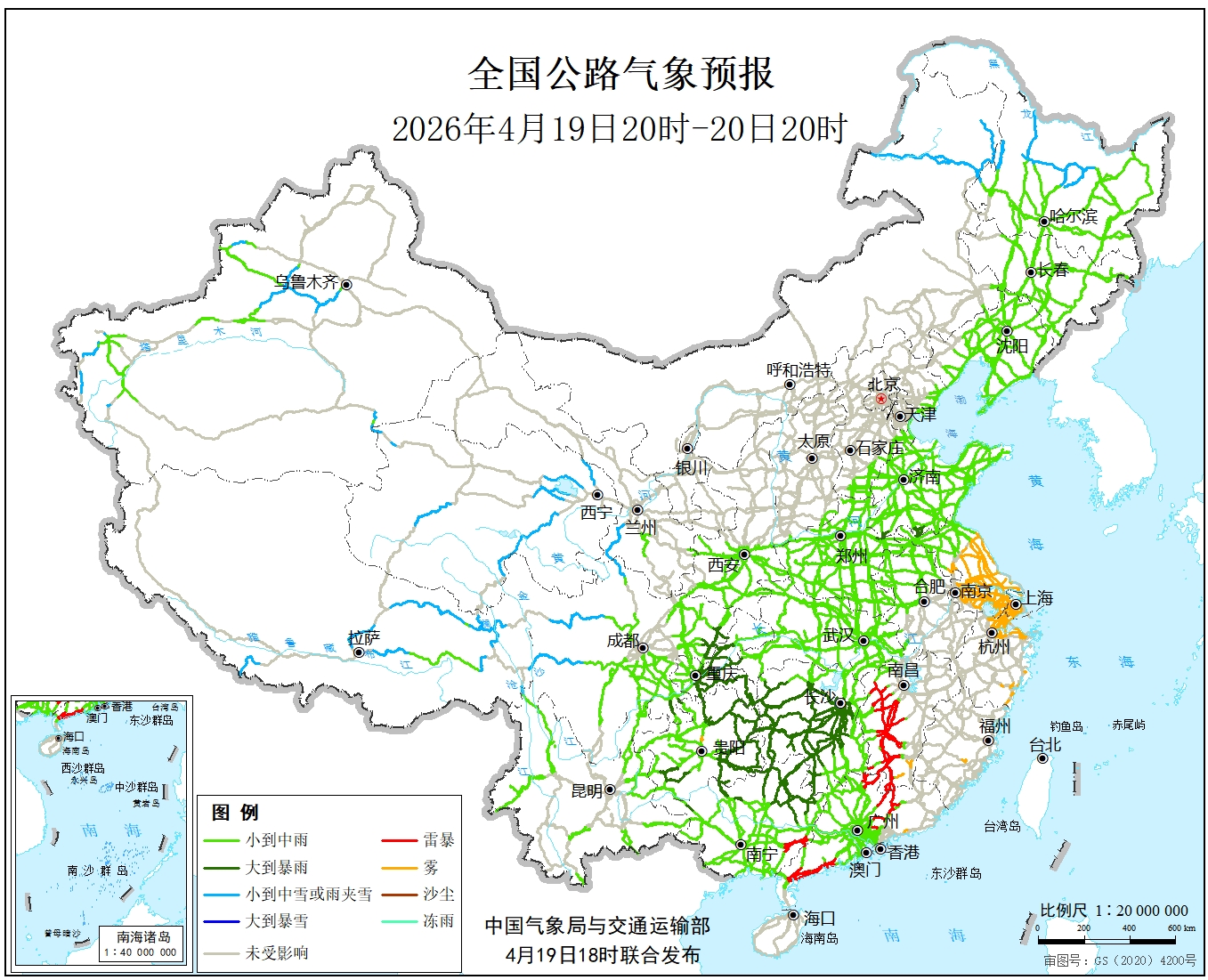 中国气象局与交通运输部2026年04月19日联合发布全国主要公路气象预报