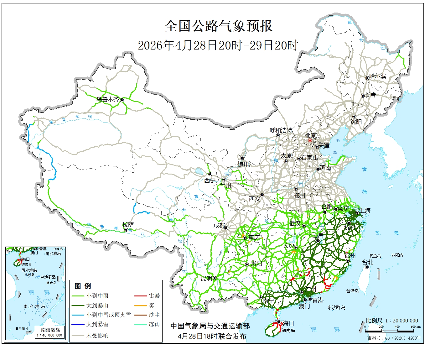 中国气象局与交通运输部2026年04月28日联合发布全国主要公路气象预报