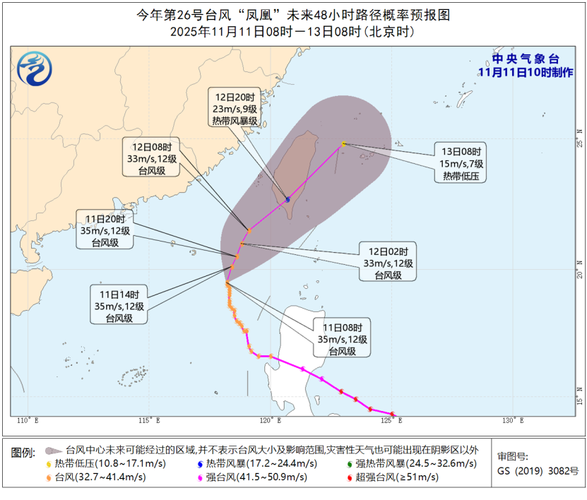 大风预报:11日14时到12日14时,东海南部海域、台湾以东洋面、黄岩岛、中沙群岛、南海北部和中部、浙江沿海、福建沿海、广东沿海、台湾岛沿海将有6-8级、阵风9-10级的大风,台湾海峡、巴士海峡、南海东北部和中东部的风力可达9-11级,阵风12-13级,台风“凤凰”中心经过的附近海域和地区风力可达12级,阵风13-14级。