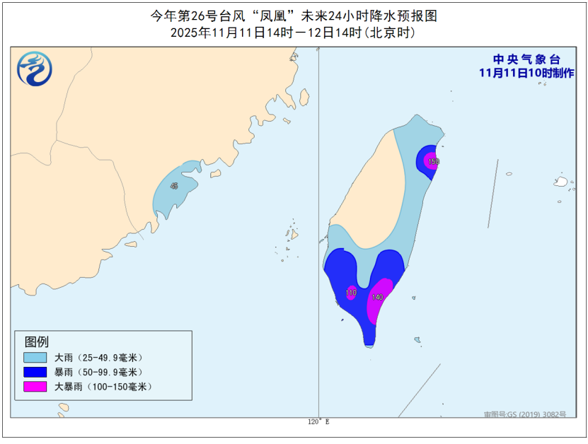 降水预报:11日14时到12日14时,福建东南部、台湾岛东部和南部将有大到暴雨,其中台湾岛东北部和东南部地区有大暴雨(100-150毫米)。