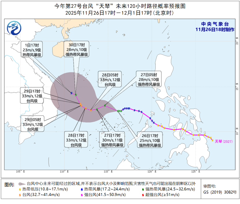 今年第27号台风“天琴”已于今天(26日)下午加强为强热带风暴级,下午5点钟其中心位于海南省三沙市(西沙永兴岛)东南方约650公里的南海东南部海面上,就是北纬12.3度、东经116.1度,中心附近最大风力有10级(25米/秒),中心最低气压为985百帕,七级风圈半径120-180公里。