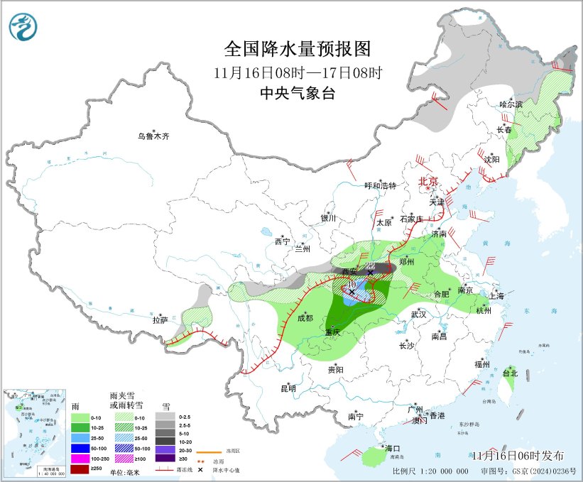 11月16日08时至17日08时,内蒙古东北部、东北地区东部和北部、西北地区东南部、陕西中南部、黄淮西部、江汉西部、川西高原北部、重庆北部等地部分地区有小到中雪或雨夹雪,其中,陕西南部、重庆北部、河南西部、川西高原北部等地部分地区有大雪,秦岭及大巴山局地有暴雪或大暴雪(20~22毫米),新增积雪深度6~12厘米,局地可超过15厘米;黄淮西部、江淮西部、江汉中西部、西南地区东部、海南岛等地部分地区有小到中雨,其中,陕西东南部、四川东北部、重庆西北部等地部分地区有大雨(25~40毫米)。新疆东部和北部、青海东北部和西南部、内蒙古中东部、黑龙江东部、华北北部和东部、黄淮西部、江淮、江汉等地的部分地区有5~6级风、阵风7~9级;渤海、渤海海峡、黄海大部、东海西部、台湾海峡、巴士海峡、南海北部和中部、北部湾偏南海域将有7~8级风、阵风9~10级(见图5)。
