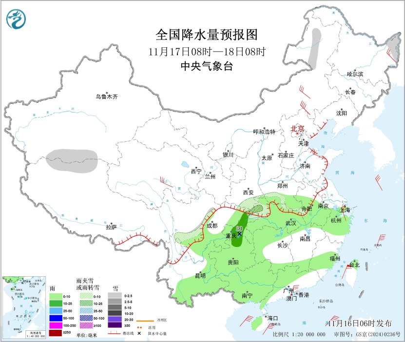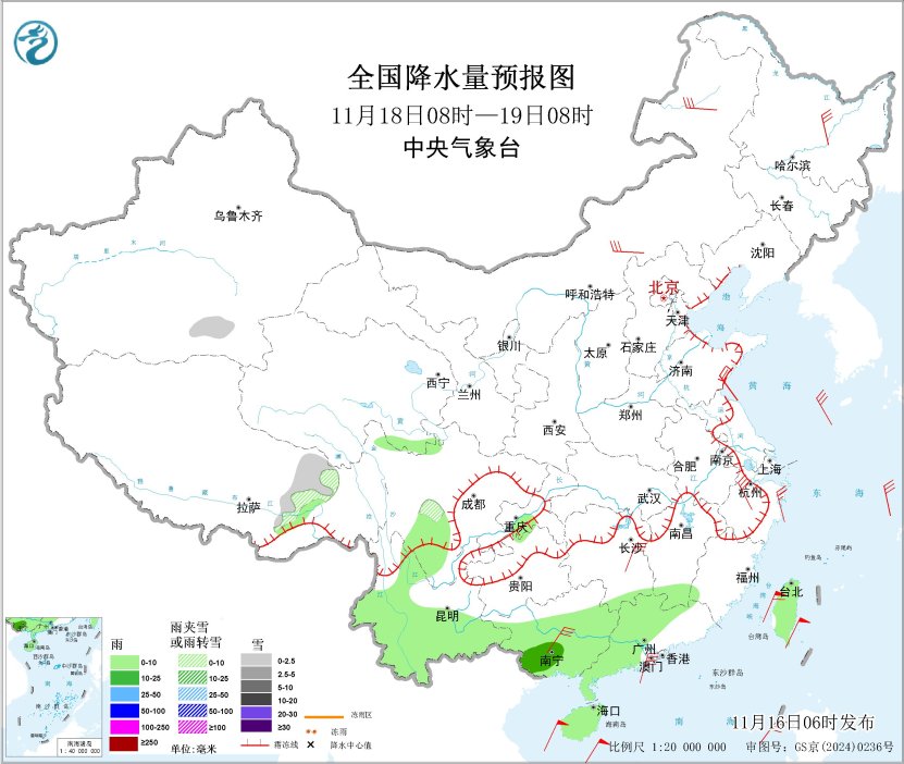 图6 全国降水量预报图(11月17日08时-18日08时)