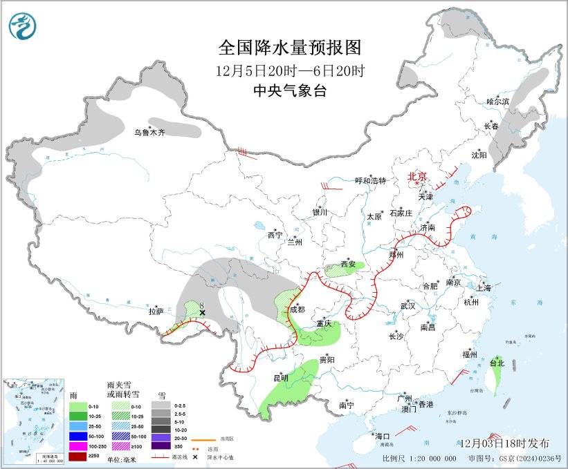 图2 全国降水量预报图(12月4日20时-5日20时)