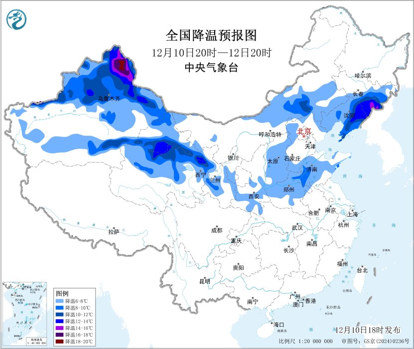 受寒潮影响,预计12月10日夜间至13日,我国大部地区将自西向东出现大风降温,日平均或最低气温普遍下降6~10℃,新疆北部、甘肃、陕西南部、华北西部和南部、东北地区中南部、黄淮北部和中部、江淮西部以及江南北部等地部分地区下降10~12℃,局地降温可达14~16℃(见图1)。12月14日早晨,最低温度0℃线将南压至浙江南部、江西北部、湖北南部一带(见图2)。预计,12月10日20时至12日20时,新疆北部、青海北部、甘肃河西、内蒙古中部、东北地区中南部、华北西部和南部、黄淮等地气温下降6~10℃,其中,新疆北部、吉林东南部、辽宁东部等地的部分地区降温可达10~16℃(见图3),中央气象台12月10日18时继续发布寒潮蓝色预警。