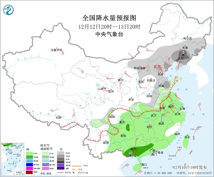 图5 全国降水量预报图(12月10日20时-11日20时)