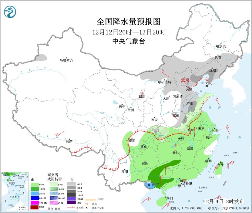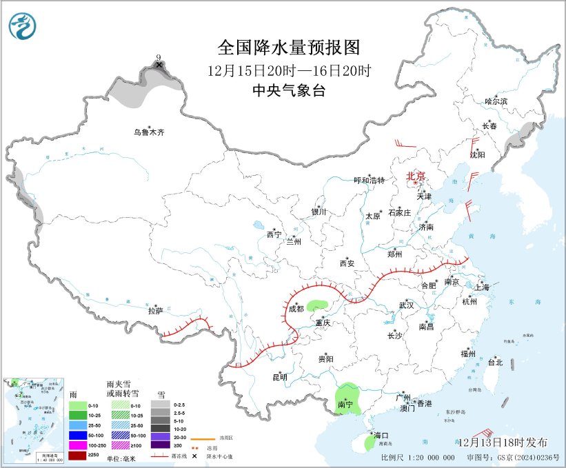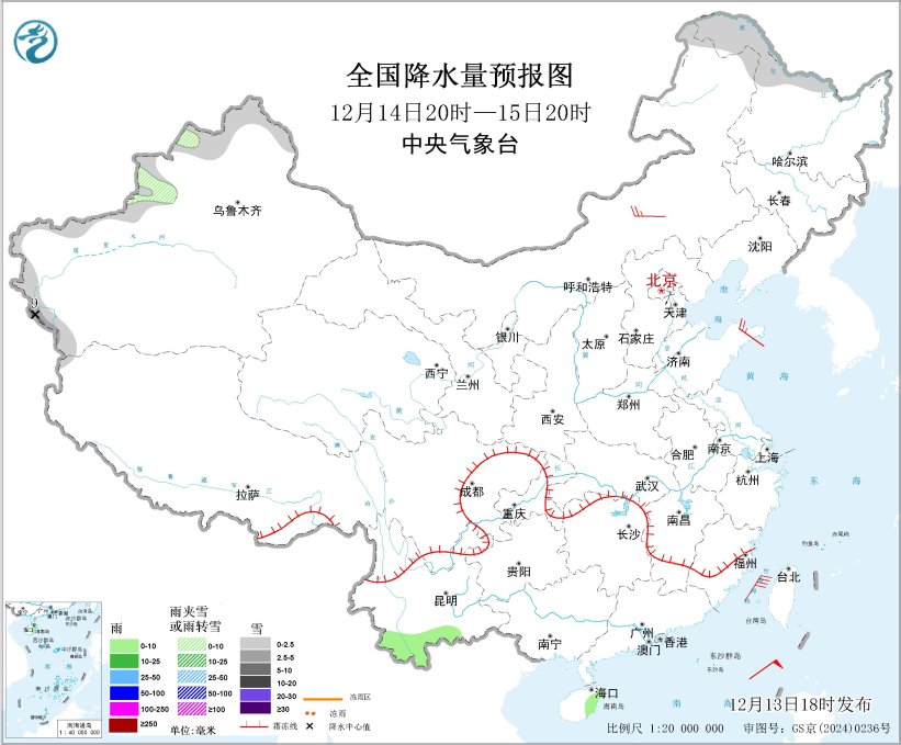 图2 全国降水量预报图(12月13日20时-14日20时)