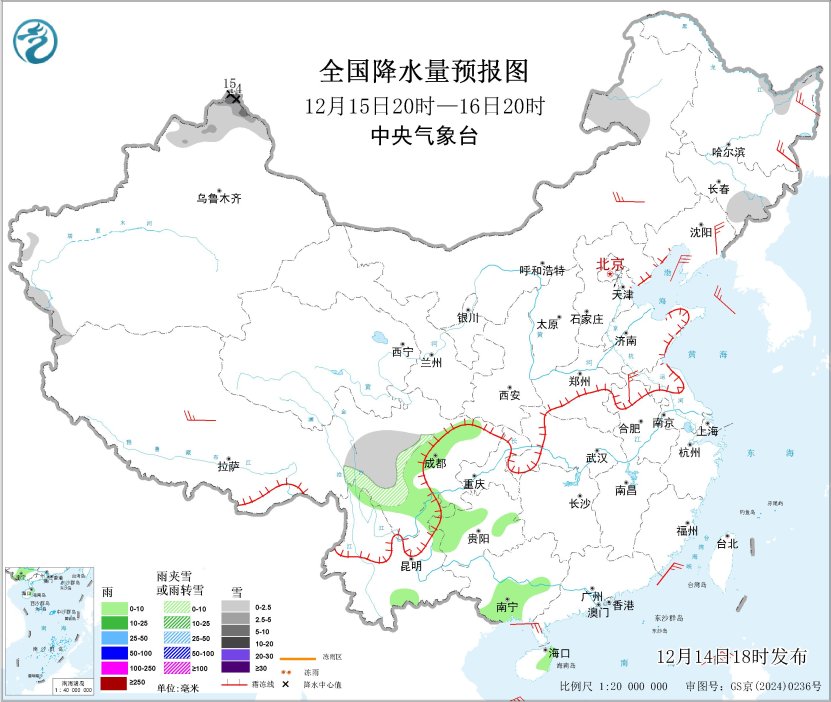 图2 全国降水量预报图(12月14日20时-15日20时)