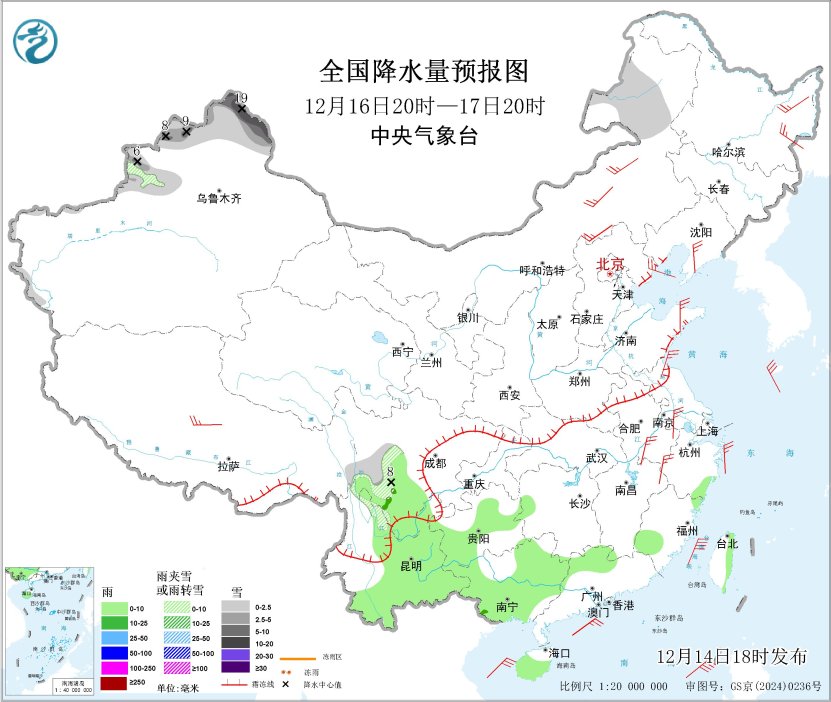 12月14日20时至15日20时,新疆北疆北部和南疆西部山区、西藏东部、黑龙江北部等地部分地区有小雪或雨夹雪,其中,新疆南疆西部山区局地有中到大雪(5~8毫米);云南南部、海南岛东部等地部分地区有小雨。新疆北部、甘肃北部、内蒙古西部、西藏北部等地部分地区有5~6级风,阵风7级;台湾海峡、巴士海峡、台湾以东洋面、南海中北部和西南部海域有7~8级风,阵风9级,其中巴士海峡部分海域风力可达9级、阵风10级(见图2)。