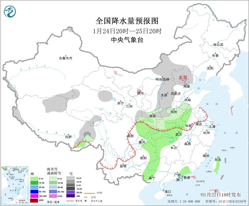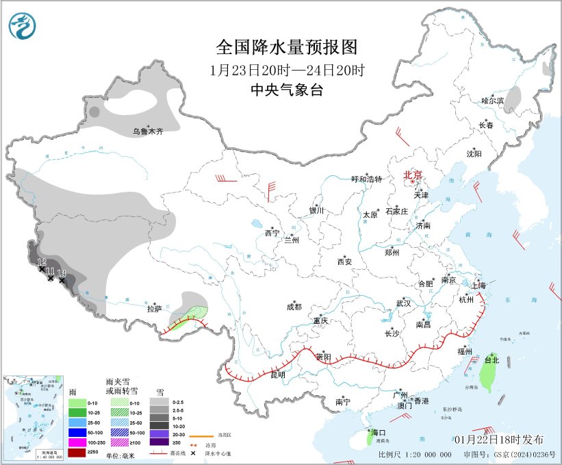 图1 全国降水量预报图(1月22日20时-23日20时)