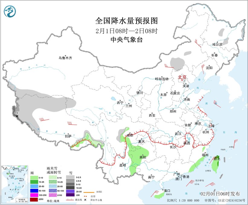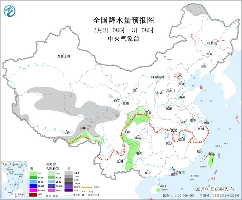 图2 全国降水量预报图(2月1日08时-2日08时)