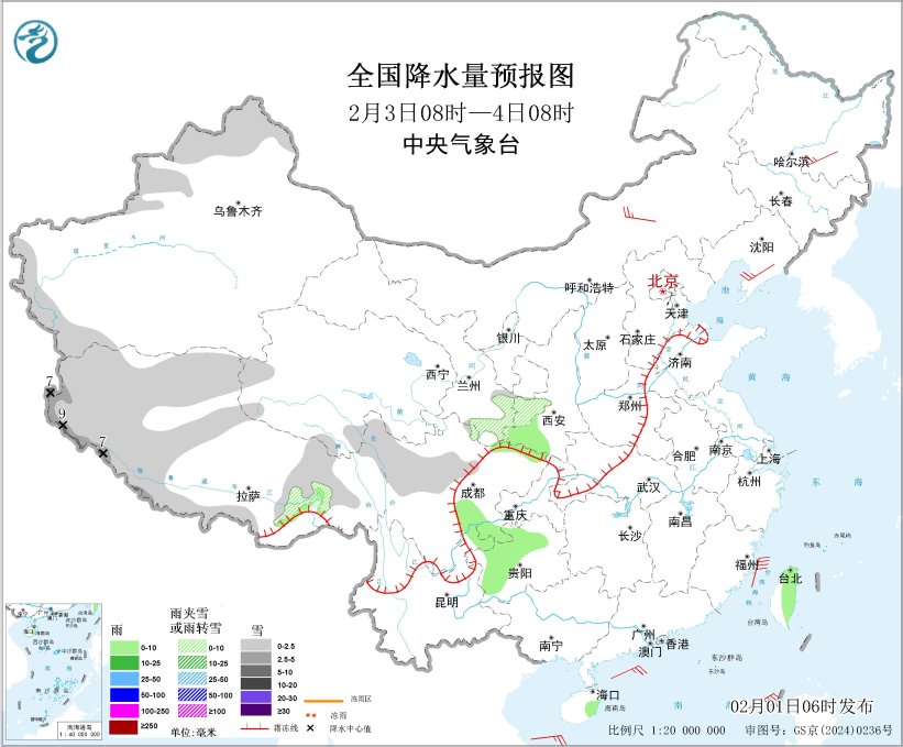 图4 全国降水量预报图(2月3日08时-4日08时)