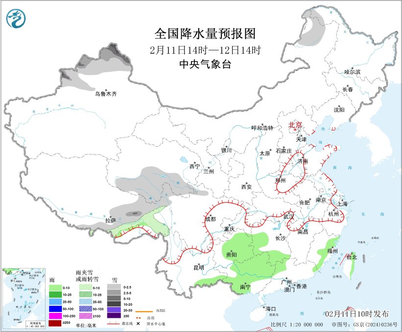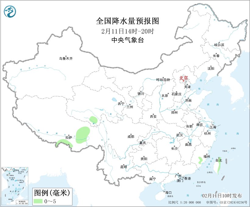 图1 全国降水量预报图(2月11日14时-20时)