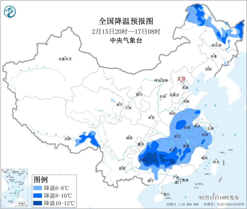 受强冷空气影响,预计,2月15日20时至17日08时,内蒙古东北部、黑龙江中北部、黄淮中南部、江淮、江汉中东部、江南大部、西南地区东南部、华南北部等地的部分地区将降温6~8℃,其中,贵州东南部、湖南南部等地的局部地区降温可达10℃以上(见图1)。2月17日凌晨最低温度0℃线将南压到江淮至江汉中部一带(见图2)。中央气象台2月15日18时继续发布寒潮蓝色预警。