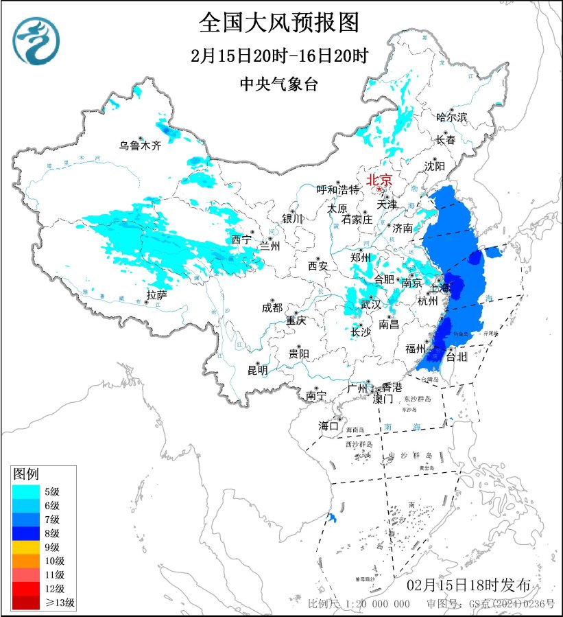 预计,2月15日20时至16日20时,内蒙古中东部、山东半岛、黄淮西部、江淮、江南北部、江汉东部,以及新疆北部和东部、西藏北部、青海南部和东部、甘肃河西等地的部分地区有5~6级、阵风7~8级的风;黄海大部海域、东海大部海域、台湾海峡、台湾以东洋面有7~8级、阵风9级的大风(见图3)。中央气象台2月15日18时继续发布大风蓝色预警。