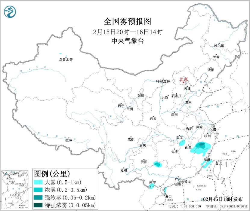 预计,2月15日夜间至16日上午,福建沿岸海域、台湾海峡西部海域、广东西部沿岸海域、琼州海峡东部海域、雷州半岛东部附近海域、北部湾北部海域将有能见度不足1公里的大雾。此外,2月15日夜间至16日早晨,浙江南部、福建北部、江西东北部等地有能见度不足1公里的大雾,局地有能见度不足200米的强浓雾(见图4)。中央气象台2月15日18时继续发布大雾黄色预警。
