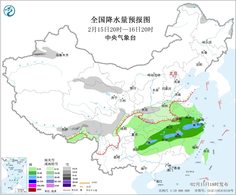 2月15日20时至16日20时,新疆沿天山地区和伊犁河谷、西藏东部、陕西南部、黄淮西部、湖北北部、川西高原等地部分地区有小到中雪或雨夹雪,其中,新疆伊犁河谷、西藏东南部等地部分地区有大雪(5~8毫米)。黄淮西部、江淮大部、江汉大部、江南大部、西南地区东部、台湾岛等地部分地区有小到中雨,其中,安徽南部、湖南北部、江西北部、浙江北部等地部分地区有大雨(25~45毫米)(见图5)。内蒙古中东部、新疆北部和东部、西藏北部、青海南部和东部、甘肃河西、山东半岛、黄淮西部、江淮、江南北部、江汉东部等地部分地区有5~6级风,阵风7~8级;黄海大部海域、东海大部海域、台湾海峡、台湾以东洋面将有7~8级、阵风9级的大风。
