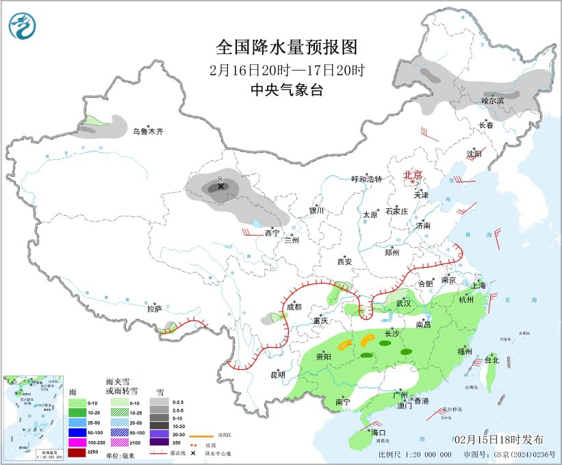 图6 全国降水量预报图(2月16日20时-17日20时)