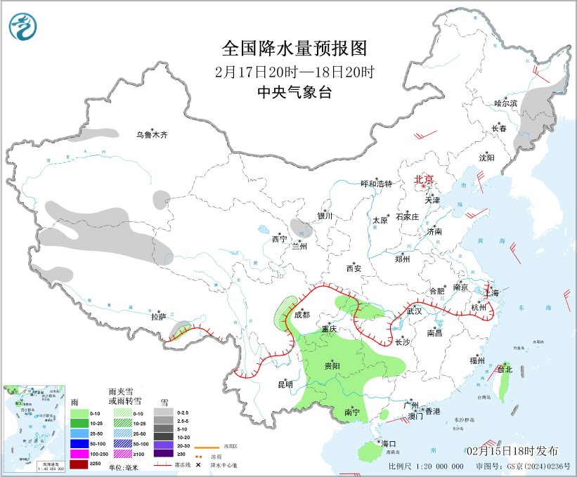图7 全国降水量预报图(2月17日20时-18日20时)