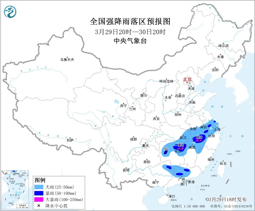 为此,中央气象台3月29日18时继续发布暴雨蓝色预警和继续发布强对流天气黄色预警。预计,3月29日20时至30日20时,湖南中北部、江西中北部、湖北东部、安徽南部、江苏南部、浙江西部以及广西东北部、广东中北部等地部分地区有大到暴雨,其中,湖南东北部、江西东北部等地部分地区有大暴雨(100~120毫米)。上述部分地区伴有短时强降水(最大小时降雨量20~50毫米,局地可超过60毫米),局地有雷暴大风等强对流天气。